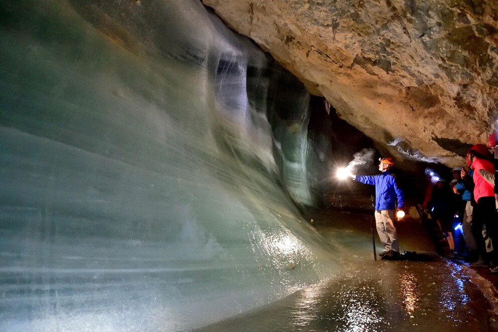 The Schellenberg Ice Cave is open from mid-May to mid-October—depending on snow conditions, explains Helfried Unterberger. There are two ways to reach the cave—but only on foot. Those with mountain experience can reach the ice cave from Marktschellenberg in about two and a half to three hours. Alternatively, there is the Untersberg cable car. However, you must also plan for a short hike of about two and a half hours from there.