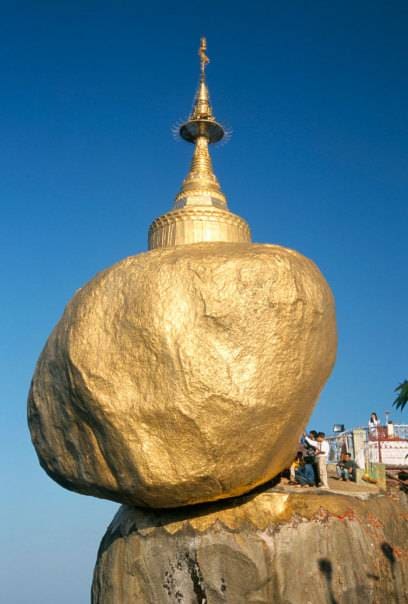 The Golden Rock looks as if it could tumble down the slope at any moment. However, legend has it that two Buddha hairs prevent it from falling. The gold shines so brightly because every man can buy gold leaf to stick on the sacred rock. Unfortunately, this practice is forbidden for women.