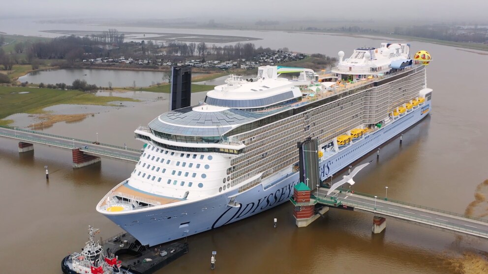 The video shows how the Odyssey is towed down the Ems River by two small boats. The journey from Papenburg to the North Sea took more than ten hours, covering 32 kilometers. This is particularly tricky because the Ems is not ideally suited for a ship as gigantic as the Odyssey of the Seas. The new giant is 41 meters wide and 347 meters long.