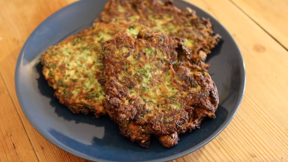 - Pour sunflower oil into a pan until the bottom is covered. Add a heaping tablespoon of vegetable batter to the pan and shape into flat fritters. Then fry until golden brown on both sides.
